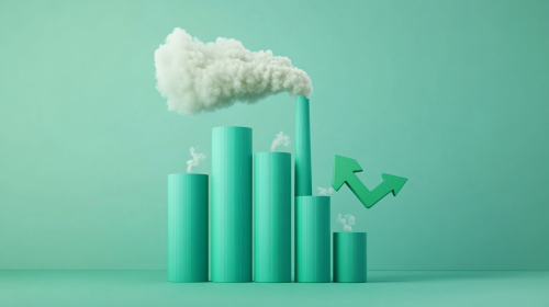 depicts a stylized bar chart with three-dimensional green cylindrical bars of varying heights on a solid background. The tallest bar has a factory-like chimney on top, emitting puffs of white smoke that form clouds. A green arrow is leaning against the second tallest bar, pointing upwards --ar 16:9