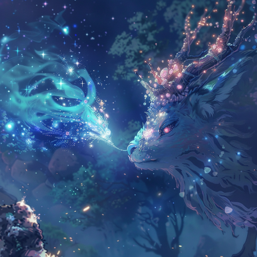 a forest spirit summoning fire, talking to a smoke spirit, made of constellations and faceted opals, iridescent, lustrous, sparking, wonder, in the liquid galaxy, --sref 3240582097 --sw 25 --v 6.0