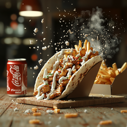 A very realistic side image of a taco consisting of a thin, toasted Armenian teak loaf. It contains pieces of chicken and french fries with white sauce, so that part of the chicken pieces, french fries and white sauce fly over the sandwich in the air, in an artistic advertising design, with smoke rising from it. And the white sauce appears in an advertisement. Next to this sandwich is a box of french fries with ketchup sauce in an advertisement, and next to them is a can of Coca-Cola that appears in an advertisement.