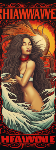 Design an eye-catching label for 'Hawaiian Heatwave Smoke' hot sauce. The label should seamlessly blend the following elements: a tropical scene with crashing waves and surf, a Hawaiian woman embodying the spirit of the islands, a prominent image of a ripe pineapple, smoky paprika accents, and red habanero peppers to represent the heat. The overall design should evoke the essence of Hawaii's culture, tropical beauty, and the intense flavor of the sauce. --no bottle, glass bottle, jar, can --ar 3:8
