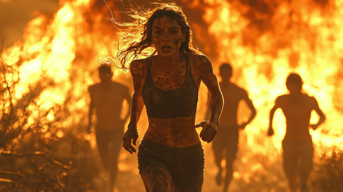 people running toward the camera and away from wildfires that are burning their suburban homes, smoke, flames, terrified people running for their lives, bright daylight and light of flames --ar 16:9 --q 2 --s 750