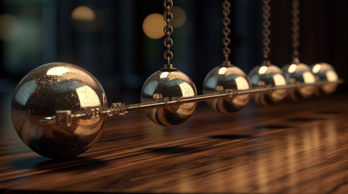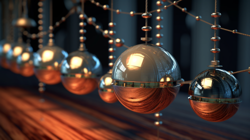 action shot of pendulum balls swinging back and forth, massurrealism, intricate details, clear features, global illumination Nikon D850 DSLR 200mm f/1.8 lens, f/2.2 aperture, 50k, 3D, UHD, rtx on --v 5.1 --s 1000 --ar 16:9