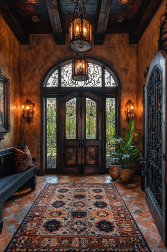 Show a Western Gothic home decor themed entryway, where several pendulum pendants hang from a high ceiling, swinging gently and casting an oscillating light across the ornate, tiled floor. The walls are adorned with dark, rich tapestries and the occasional ornate mirror, reflecting the movement of the pendulums. A heavy, carved wooden bench provides a place to sit and remove shoes, and a large, Gothic door with iron detailing stands ajar, inviting guests into the home. The rhythmic movement of the pendulums should create a mesmerizing welcome, setting the tone for the rest of the home’s decor. Neat and organized. Camera: DSLR - Canon EOS 5D Mark IV. Lens: Canon EF 24-70mm f/2.8L II USM. Composition: Wide shot, room-centered, horizontal orientation, balance between furniture and space. Film: Digital, high resolution, color profile sRGB. Camera settings: ISO 400, f/2.8, 1/60 sec. --ar 2:3 --v 6.1 --s 250