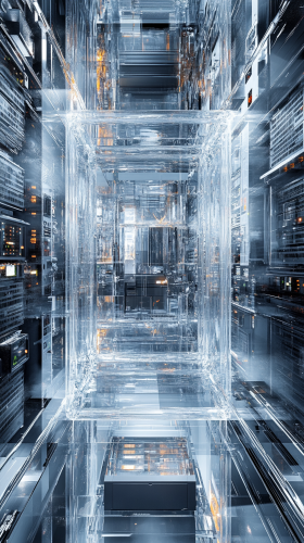A transparent crystal box room containing a 3D data servers room. The entire scene is visible from above and centered in the crystal with a sense of inmmersive deep, showcasing how the various elements fit together within the crystal box room, ultra realsitic, futurstic, ultra detailed, cinema 4D --ar 9:16 --v 6.1