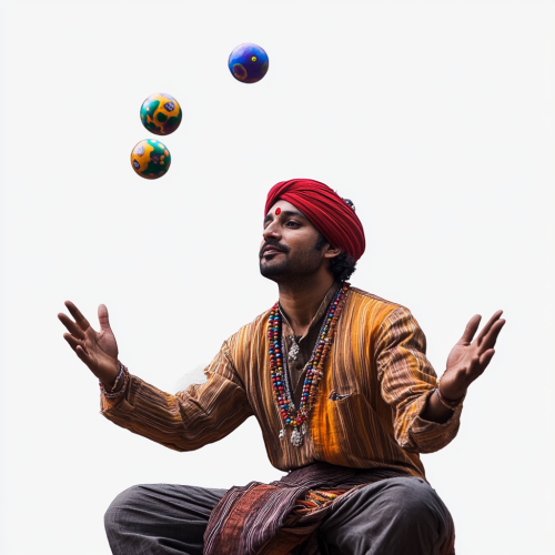 Generate a high-resolution image of a man juggling exactly three balls on a transparent background. The balls vary in size: one small, one medium, and one large, with each ball clearly larger than the last. The balls should be evenly spaced apart, making them easily distinguishable. The man should have a focused expression, with the balls positioned in mid-air to show the motion of juggling. The scene should be simple and clean, with no distractions, ensuring the three balls are the focal point, symbolizing small, medium, and large sizes.