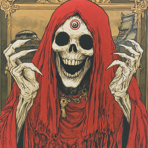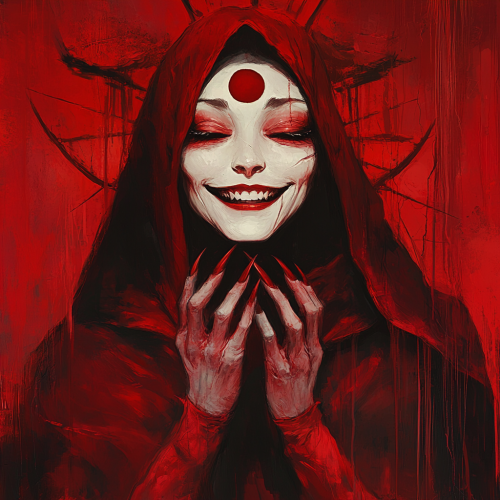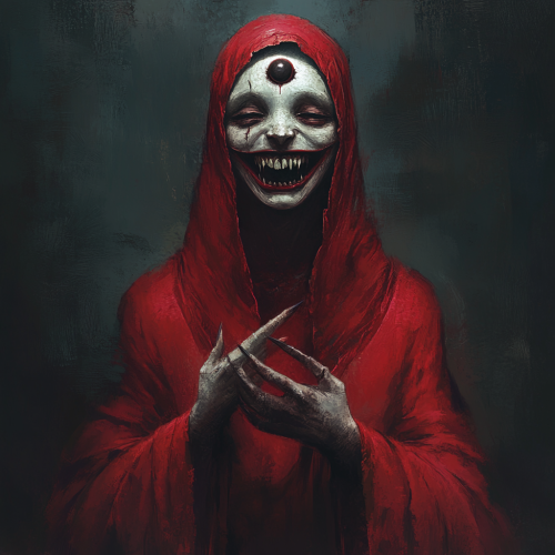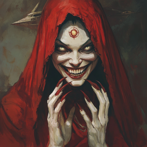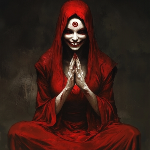 Persephone from the Duma Key Stephen King novel. With ghostship. Female who wears a red robe. Her face has grin as wide as her face. Third eye on her forehead. Claw hands.