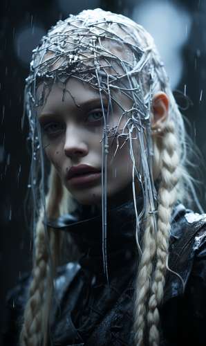Hd, high res, render 3d, fantasy goth, dof, jofa veem, sadness in eyes, sorrow, misery, albino white queen with third eye in chest, yearning to be human, watercolor filter blur, money style,****rain filter blur, depth of field, 47mm lens, Albino white airy braided hair, forest galaxy queen with textured Cosmos veins, medeival cave with wings and tatoos, third eye in chest ultra, realism, cinematic, detailed, style of dali and stephen king, eerie, fear, hd, dof, high res, unreal engine, gothfantasy 32k, rage, sorrow, evocative minimalism, subtle catchlight, Hdr, 3d, award winning, poster-cubism, 3d --ar 9:15 --upbeta --s 750