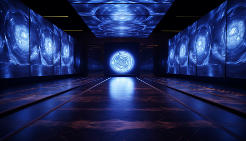 an immersive reality art museum, whole walls and floor is a screen, exhibiting a third eye chakra animation, indigo blue and shades of lighter blue colors, photography --ar 7:4