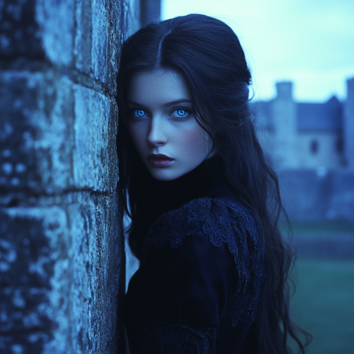 renaissance style mamiya photograph style depiction of a dark haired woman wearing a high necked black dress with ice blue eyes peering from behind a castle wall in a blue tinted night sky