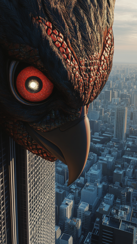 Giant, a massive floating Tengu mask yokai, only partially visible as it peers over the edge of a modern Tokyo skyscraper, its sharp beak and one glowing eye casting a long shadow on the city below, Real Engine, Super-Resolution, Ray Tracing, high resolution photography, 4k, studio photo, elegant --ar 9:16 --v 6.1
