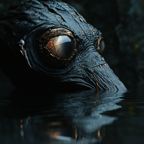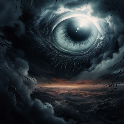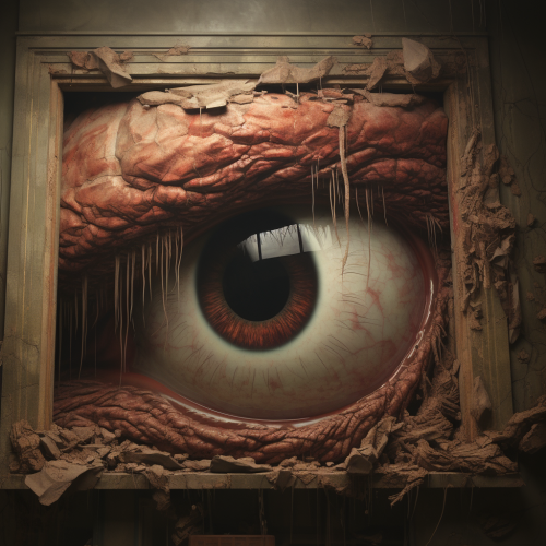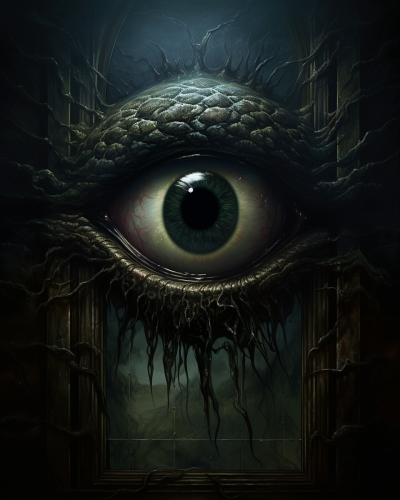 surrealism art, giant reptilian monster eye peering inside unbroken house window. Dark stare, --no people --ar 4:5