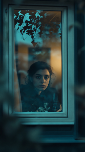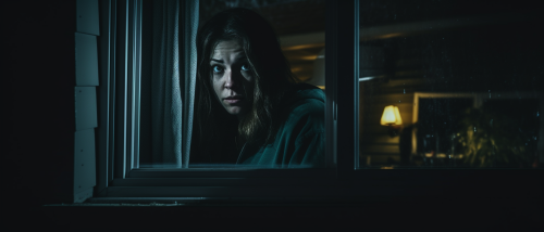 a female burgler looks into a houses window, night, Cinematic film photography, wide angle, dark, moody, blurry photo, imperfections, ethereal, cinestill, --ar 21:9 --style raw