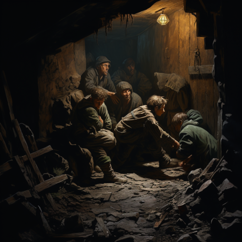 adventurers peering into a dark and sinister hole in the wall in a ransacked basement