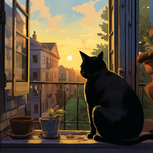 a children’s book illustration of a fat black cat peering out the window of a patio apartment at an older stray gray cat with a gaze of romance.