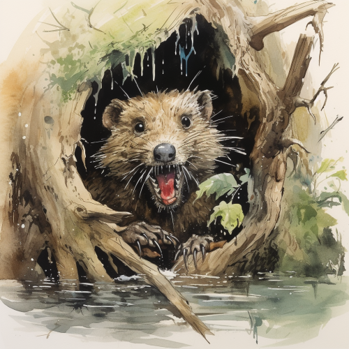 hidden behind a tree, a beaver with two big front teeth hiding, peering out, ralph steadham style, creepy