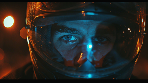 centered close-up shot of a man's eyes behind his motorcycle visor at night. In the style of David Fincher. Dark, moody, atmospheric, cinematic. 35mm filmstock. --ar 16:9