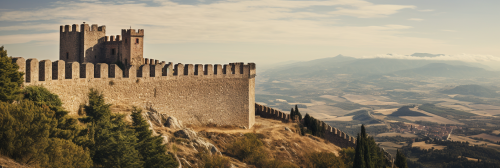 peering over the castle wall of a mediaeval Italian hilltop fort --ar 3:1