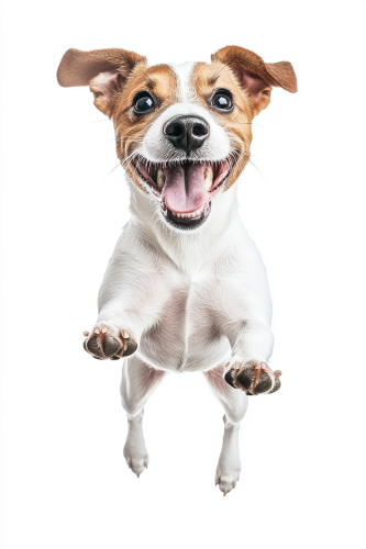 portrait photograph of a stocky jack russell dog is jumping into the air, happy expression, full lenght shot, isolated on white background --ar 2:3 --style raw