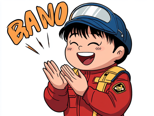 happy air traffic controller clapping to congratulate us, facing us, drawn in the style of akira Toriyama's Dr. Slump, motion lines show the clapping, white background, BRAVO written in fantasy letters in the background --ar 4:3