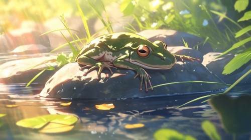 Portrait of little greean frog sleaping on a rock in a greean pond, the sun is shining, distorted realism, use all bright colors, full HD 24K, sharp on details --ar 16:9 --niji 5 --s 250