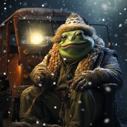 create a nft of a happy bull frog person/truck driver in the snow storm 8K --s 250