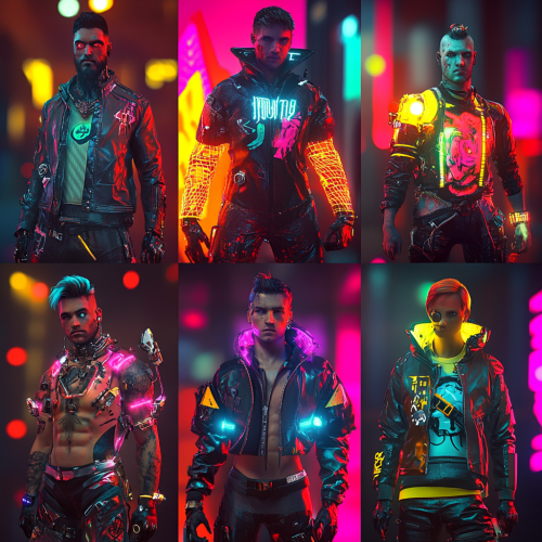A set of 10 unique characters, each with distinct cyberpunk-inspired clothing, hairstyles, and accessories. Each character is posed against a neon city backdrop, with different expressions and color schemes. One character has glowing robotic arms, another with vibrant tattoos. High detail, futuristic style, perfect for NFTs. --ar 1:1