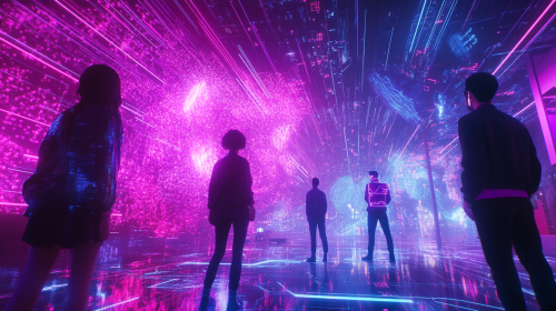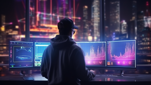 neon, gradient color, trader operating hologram terminal, 8k, high resolution, --ar 16:9