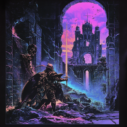 Frank Frazetta 80s style black metal style medieval gothic architecture framework hologram neon lights purple colors painting The Death Dealer warrior T-Shirt design black - - v6.1