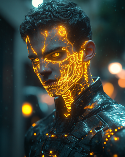 A handsome man with a neon yellow, glowing skeleton body art, wearing leather armor, in the front view, with neon light on his face, in a 3D render style, in the style of Greg Rutkowski, trending on CG Society, with a cyberpunk aesthetic, detailed anatomy, and a colorful, detailed background, with a symmetrical composition and a skull-like head. --ar 4:5 --stylize 750 --v 6.1