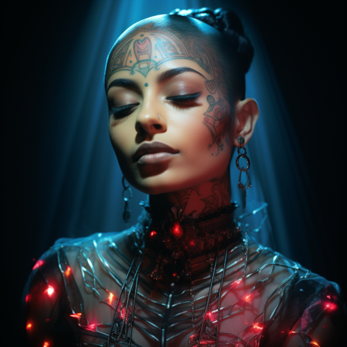 biometric hologram tattoo with neon lights (hologram lights, fluorescent) makeup style | portrait of a bald indian woman with jewellery | polaroid shot | underreliefcore, glasscore filter --style raw --s 750
