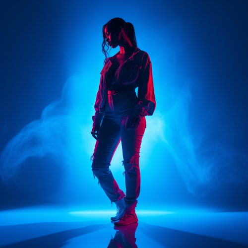 full body silhouette of a women on a blue photo background. Cinematic style. neon lighting. Urban clothing