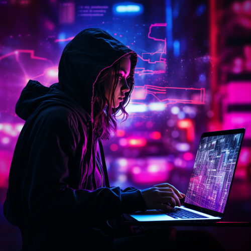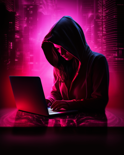 silhouette of a female hologram in a cyberpunk setting, being viewed through a laptop camera. the colours are neon purple, neon pink, and neon red, and the image is grainy