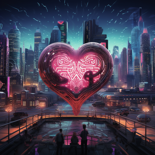 The album art could be a combination of cyberpunk and retro-futuristic aesthetics. Imagine a neon-lit cityscape at night, with towering skyscrapers and intricate details that suggest a blend of the past and future. Central Image: In the foreground, you could place a stylized, surreal heart-shaped object with intricate patterns, circuits, and neon lights running through it, representing the theme of "Heart Stopper" and the album's fusion of emotions and technology. Cityscape: Behind the central image, have a sprawling, dystopian cityscape with neon signs, futuristic vehicles, and an air of enigmatic charm. This backdrop represents "Enmity City" and sets the tone for the entire album.Elixir: Within the cityscape, incorporate a hidden element that hints at the "Taste of Elixir." This could be a mysterious vial or potion placed somewhere in the cityscape, glowing softly amidst the neon lights.Yearning in Neon: Emphasize the yearning aspect by having a lone figure, perhaps a silhouette of a person, standing at the edge of a building, gazing at the neon-lit city below, lost in thought.Tangled Desires: Suggest the idea of tangled desires with subtle visual cues like intertwining vines or wires in the background, subtly connecting various elements of the artwork.Depths of Mystery: Add an aura of mystery by shrouding parts of the city in darkness or mist, leaving some aspects hidden and open to interpretation.Color Palette: Utilize a vibrant neon color palette with shades of electric blue, neon pink, and deep purples against a dark, inky background. These colors will create a sense of contrast and intrigue.Typography: Choose a sleek, futuristic font for the album title and track names, giving a modern and edgy touch to the overall design.
