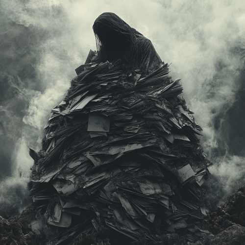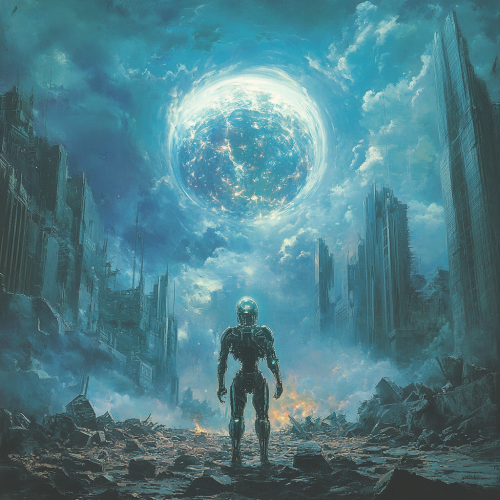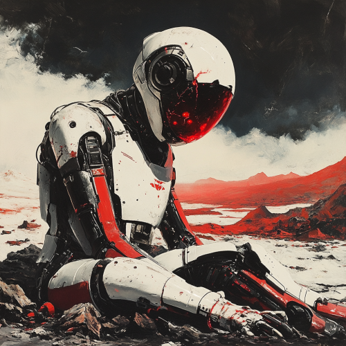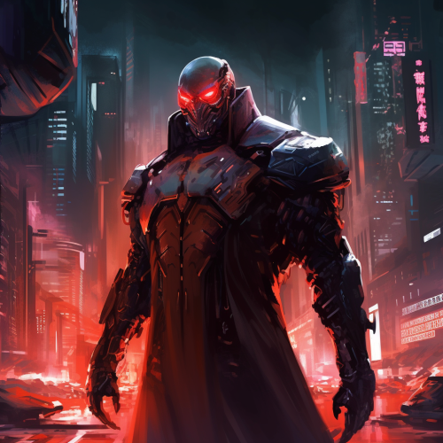 album cover. The same cyborg,, stands at the edge of a chaotic, dystopian metropolis engulfed in a storm of sound and fury. The city below is a cacophony of blaring alarms, screeching machinery, and frantic human voices, all blending into an overwhelming, oppressive noise. The environment is dark, with towering black skyscrapers piercing the red, stormy sky, illuminated by harsh, flickering neon lights. The cyborg’s expression reflects the stress and isolation, as it struggles to maintain its composure in the midst of this sensory overload. Red lightning arcs across the sky, illuminating the cyborg’s metallic form with brief flashes of white, symbolizing the inner turmoil of trying to find peace in a world that feels hostile and alien. Keywords: dystopian chaos, sensory overload, oppressive noise, dark cityscape, inner turmoil." This version emphasizes the overwhelming stress and dark atmosphere, capturing the intensity of feeling like an outsider in a chaotic world. --s 250