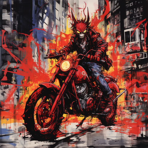 A chaotic, punk-style city, demon riding a motorcycle, red blots, in the style of Jean-Michel Basquiat