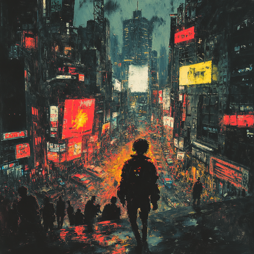 album cover. The Cyborg finds themselves on the outskirts of a sprawling, neon-lit metropolis, standing at the edge of a busy street filled with rushing crowds, blaring horns, and flashing advertisements. The unique cellphone glows brightly in their hand, its screen showing a static-filled image of a peaceful landscape, contrasting sharply with the chaotic urban environment. The scene is predominantly black and white, with the neon lights and the phone’s screen providing vivid red and yellow highlights. The Cyborg looks out at the overwhelming noise, pollution, and human activity with a sense of alienation, feeling out of place in a world so full of life yet so disconnected from peace. Keywords: neon-lit metropolis, rushing crowds, blaring noise, black and white with red and yellow highlights --s 250