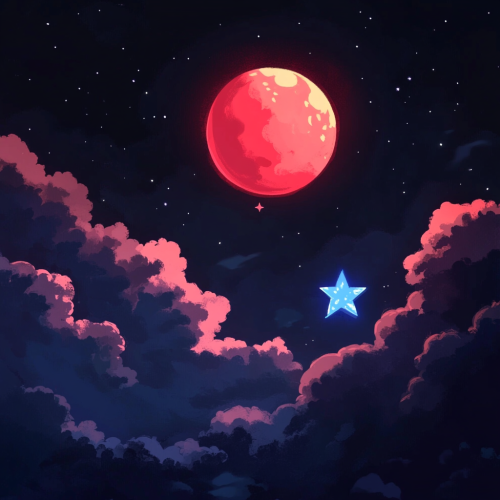 a serene night sky where a brilliant red star and a soft blue star glow side by side, casting gentle light over the landscape, their lights creating a subtle dance of colors across the horizon, the scene imbued with a sense of nostalgia and longing, anime-style with detailed star fields and delicate, hand-drawn textures, --ar 4:3 --niji 5