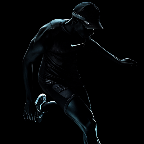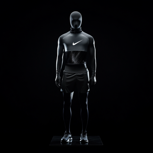 Design a dramatic, high-contrast image of an athletic mannequin dressed in Nike gear, positioned in the center against a pitch black background (#000000). The mannequin should be styled in a dynamic, sporty pose to emphasize movement and athleticism. The outfit should be a contemporary Nike sports ensemble, showcasing the brand’s style and functionality. The lighting should be stark, highlighting the contours and details of the clothing, while maintaining a minimalistic and sleek aesthetic. This image should convey a sense of strength and precision, aligning with Nike’s innovative identity.