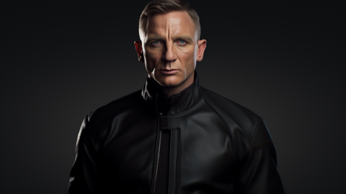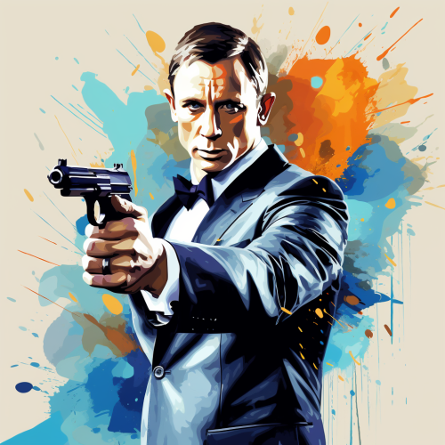 james bond as portrayed by Daniel craig, in classic style with a hint of blue in his suit, holding his gun across his body, inspired by pop art