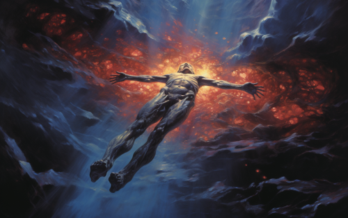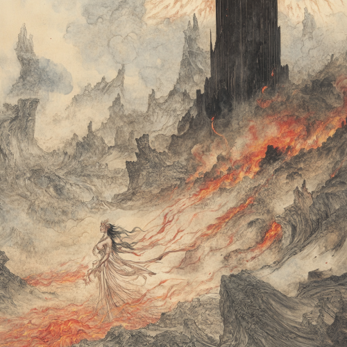 A fierce, mythical battle scene depicting Pele, the Hawaiian goddess of volcanoes and fire, confronting Lifedrinker, a towering, dark entity twice the size of the Burj Khalifa. Pele is portrayed as a powerful, radiant woman with flowing hair made of molten lava, her eyes glowing like embers. Her arms are outstretched, summoning a torrent of molten rock and volcanic fire. She stands at the mouth of an erupting volcano, with streams of lava cascading around her feet and fiery sparks flying in all directions. The ground is split open with cracks glowing red, and plumes of smoke and ash rise into the air. Lifedrinker looms above her, its dark, amorphous body swirling with a misty black void, its tendrils crackling with stolen energy. The creature’s glowing, malevolent eyes focus intently on Pele, as its tendrils reach out towards her, attempting to absorb her fiery energy. The sky is filled with a mix of dark storm clouds and fiery orange hues from the volcanic eruption, lightning bolts streaking through the scene. The atmosphere is intense, capturing the raw elemental clash between the fiery wrath of the volcano goddess and the dark, life-draining monstrosity. --sref 8282024