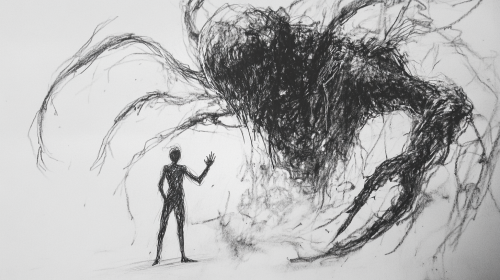 A rough, chaotic pencil sketch of a figure standing unarmed, facing a massive, terrifying unknown entity. The figure’s hands are raised in surrender, their posture expressing hopelessness and despair. The towering entity looms over them, abstract and grotesque, with jagged, chaotic lines forming its unsettling shape. The figure is small and vulnerable, overwhelmed by the sheer size and presence of the monstrous form. The sketch is messy and disjointed, with erratic strokes that enhance the feeling of helplessness and fear, as though captured in a moment of absolute despair. --c 8 --ar 16:9 --v 6.1