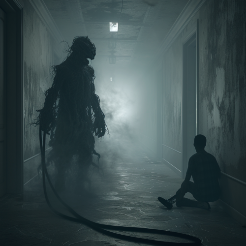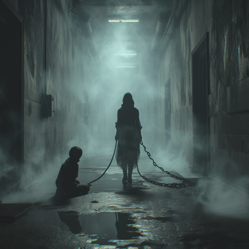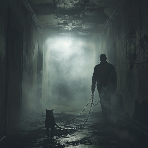 demonic entity holding person on leash, derelict hallway, foggy, dark, cinematic, ultra realistic, volumetric smoke --v 6.0