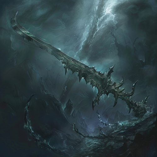 an evil sword with a notched and jagged blade, jagged protrusions from the blade like curved knives drawing backwards, darkness and death, chipped blade, fantasy art icon, stylized, ethereal effect