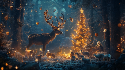 enchanted christmas festival in a clearing in an ethereal beautiful dark forest at night, mysterious forest, hauntigly beautiful image, many forest animals --ar 16:9