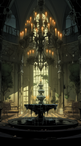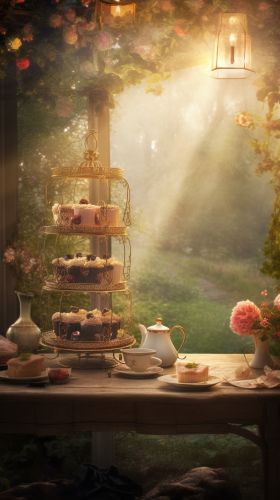 warm afternoon tea scene, a gentle breeze carrying the aroma of freshly brewed tea, an elegant table laid out with a colorful array of teacups and a towering cake, surrounded by a misty enchanted forest with glowing fairy lights, visual depth enhanced by layers of foliage and delicate flowers in the foreground, a dreamy composition that leads the eye from the table to the enchanting vista, invoking feelings of tranquility and wonder, a beautifully rich painting reminiscent of storybook illustrations. --ar 9:16 --v 5.0