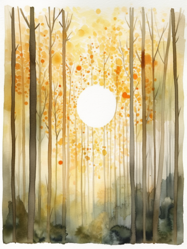 A minimalist watercolor painting, sunrise in an enchanted forest inspired by 'Dumbrava Minunată,' soft sun rays filtering through trees, warm and pastel tones with gentle oranges, pale yellows, and light browns, subtle green accents, airy and dreamy, simple details for economical printing, A4 format, high-quality, 300 DPI --ar 3:4 --v 5.0