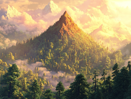 A tiny lonely mountain peak in a vast temperate forest. The trees are massive, old, thick, green, and the forest is seemingly impenetrable, with no clearings, and many different kinds of trees reaching to the horizon. The forest has a mystical energy about it. A tiny mountain peak appears in the center. The mountain is colored red by a setting sun, as are the clouds. Fantasy RPG setting, wide angle, detailed. Wild nature, dramatic atmosphere. --ar 4:3 --v 6.1 --no Conifer trees