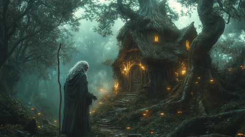 hyper-realistic photo Picture me of an ancient shaman standing in a mysterious misty forest. This sorcerer is a tall, dignified creature with a mask-like face with deep wrinkles, which contain wisdom and hidden power. His skin looks pale and ghostly, and dark shadows emphasize the contours of his face. The sorcerer is wearing a long robe of dark earthy color, and with a mixture of orange and red everywhere, he or she feels as if he or she has become one with nature. His or her head has twisted branches and a tall headdress decorated with small, shiny orange lanterns or fruits, giving off a mysterious glow. He or she holds a twisting wooden cane in one hand, symbolizing their deep connection to nature. Surrounded by dense, lush forest plants, soft mist spreads in the background, creating a surreal atmosphere.