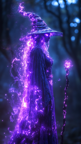 A glowing purple humanoid figure dressed as a mystical witch, complete with a flowing, ethereal robe and a pointed hat that glows with a soft purple light. The figure holds a glowing magical staff or wand, emitting radiant energy that swirls around in the form of magical runes and cosmic particles. The background is a dark, enchanted forest with twisted trees and shimmering mist, illuminated by the figure’s glow. The atmosphere is mystical, with elements of enchantment, magic, and a sense of powerful, spiritual energy emanating from the witch-like glowing figure. --ar 9:16 --s 750
