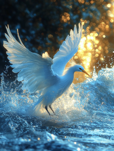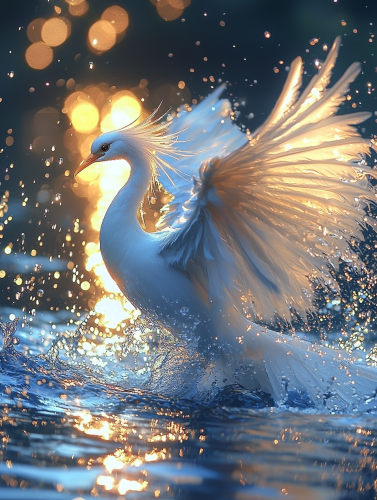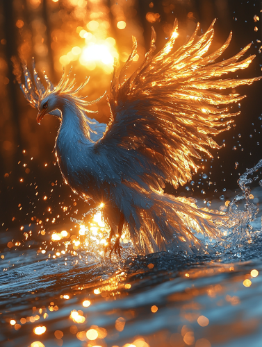 a super realistic blue beautiful pure phoenix rising out of a clean blue cristal water river, a golden sun and sunrise over the phoenix feathers, water drops over the phoenix, --v 6.1 --ar 3:4 --q 2 --stylize 1000